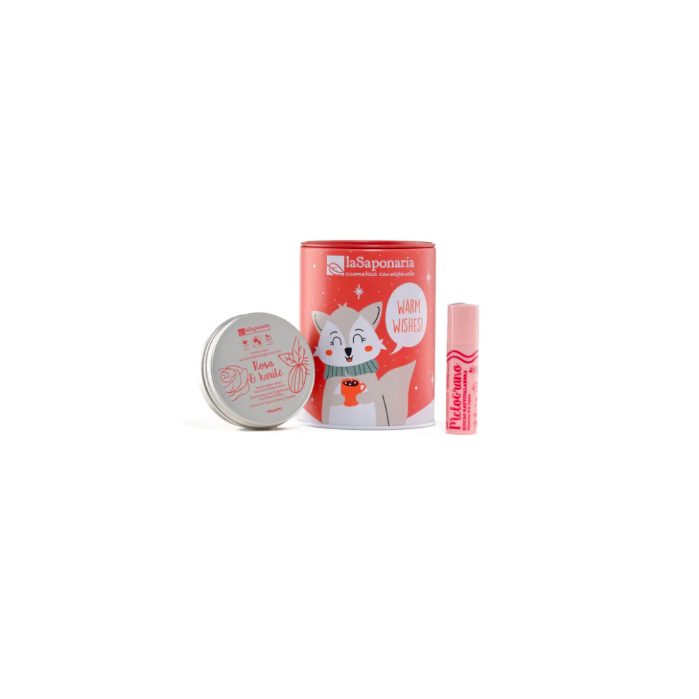 Dárková sada ukrytá v plechové pokladničce, která obsahuje Krém na ruce s Damašskou růží BIO (odkaz zde) a Tónovací balzám na rty Biocao s granátovým jablkem BIO (odkaz zde)